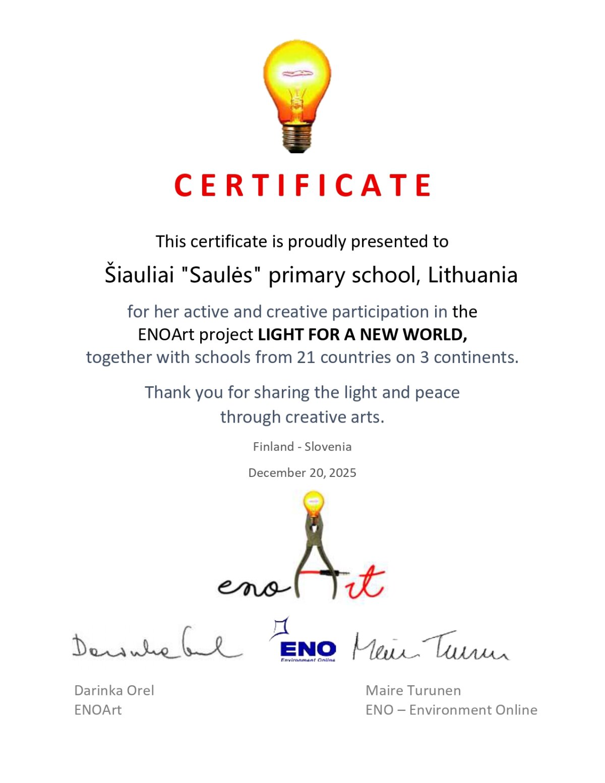 Šiaulių „Saulės“ pradinė mokykla tarptautiniame ENO projekte „Light for a New World 2025“