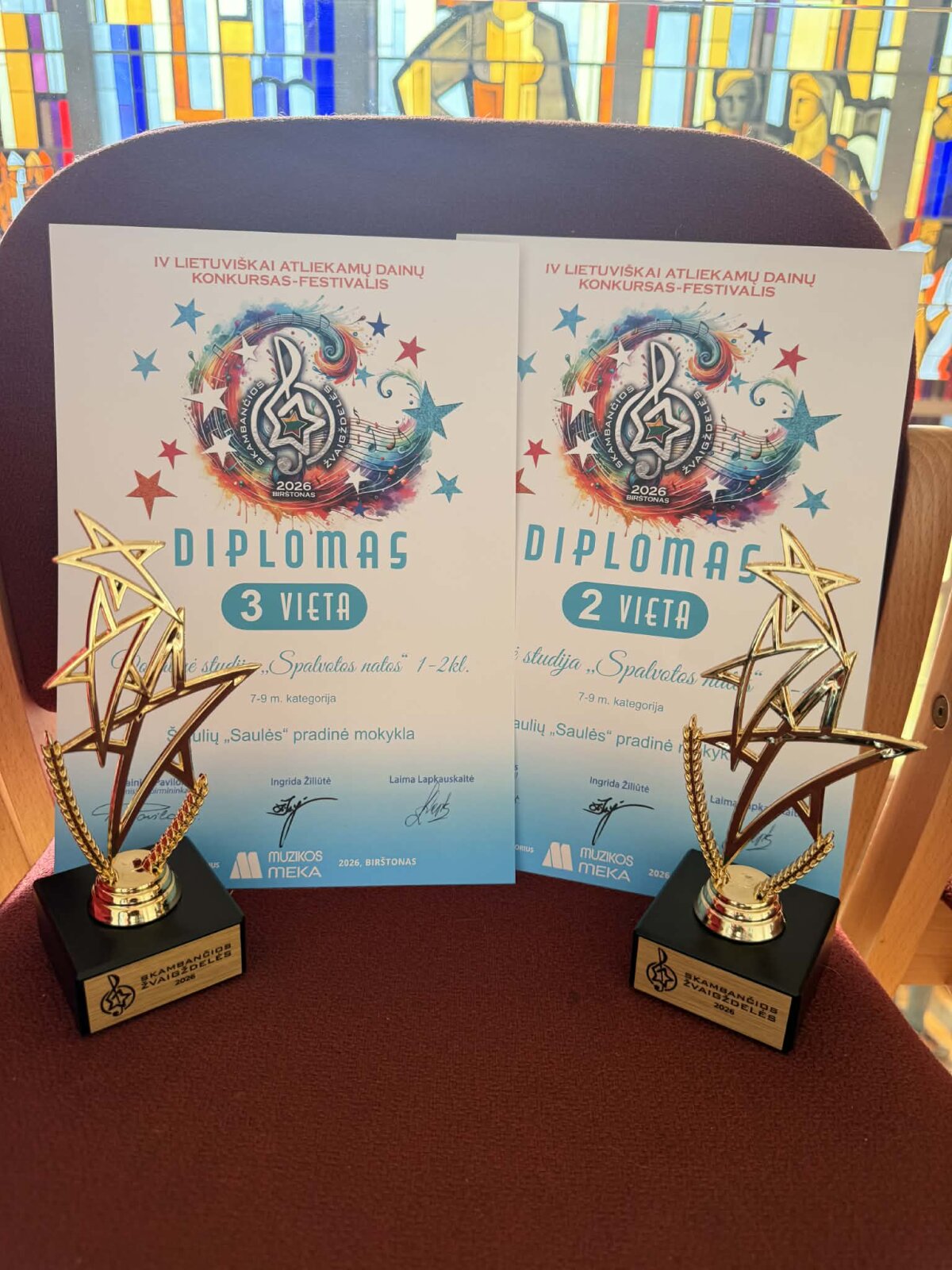 Nepaisant ankstyvo ryto ir ilgos kelionės, diena Birštone buvo kupina gerų emocijų, muzikos ir įsimintinų akimirkų. Konkurse sėkmingai pasirodė Šiaulių „Saulės“ pradinės mokyklos mokiniai: 1–2 klasių ansamblis „Spalvotos natos“ pelnė III vietą, 3–4 klasių ansamblis „Spalvotos natos“ – II vietą, o solistė Paula Musneckytė savo kategorijoje laimėjo III vietą.