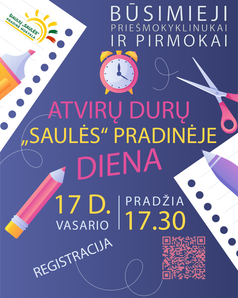 Šiaulių „Saulės“ pradinė mokykla kviečia būsimų priešmokyklinukų ir pirmokų tėvus kartu su vaikais dalyvauti Atvirų durų dienoje. Renginio metu tėvai ir vaikai turės galimybę iš arčiau susipažinti su mokykla, jos ugdymo aplinka bei bendruomene.