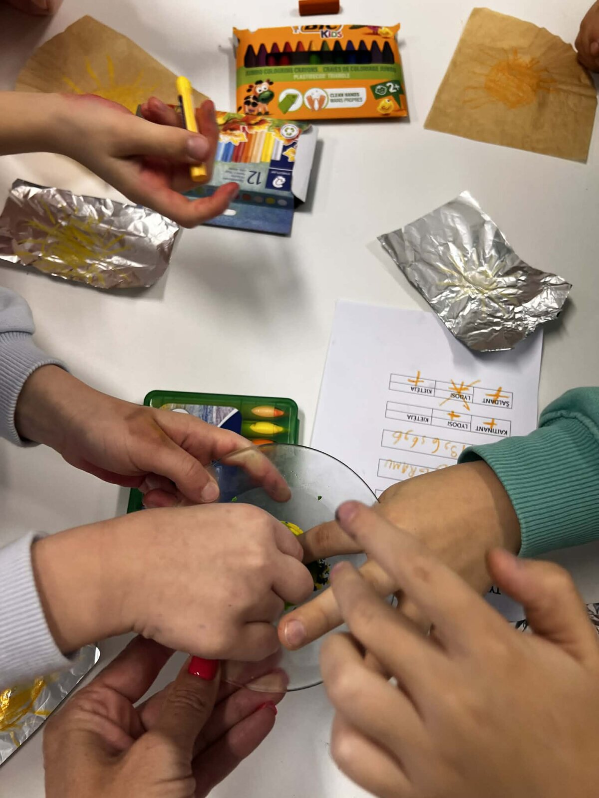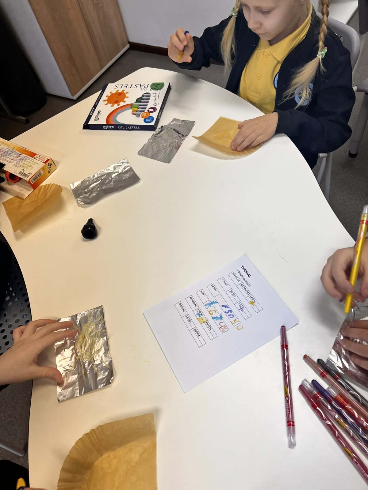 tyrinėjo, kaip šiluma veikia vaškines kreideles, stebėjo jų tirpimą ir spalvų maišymąsi;