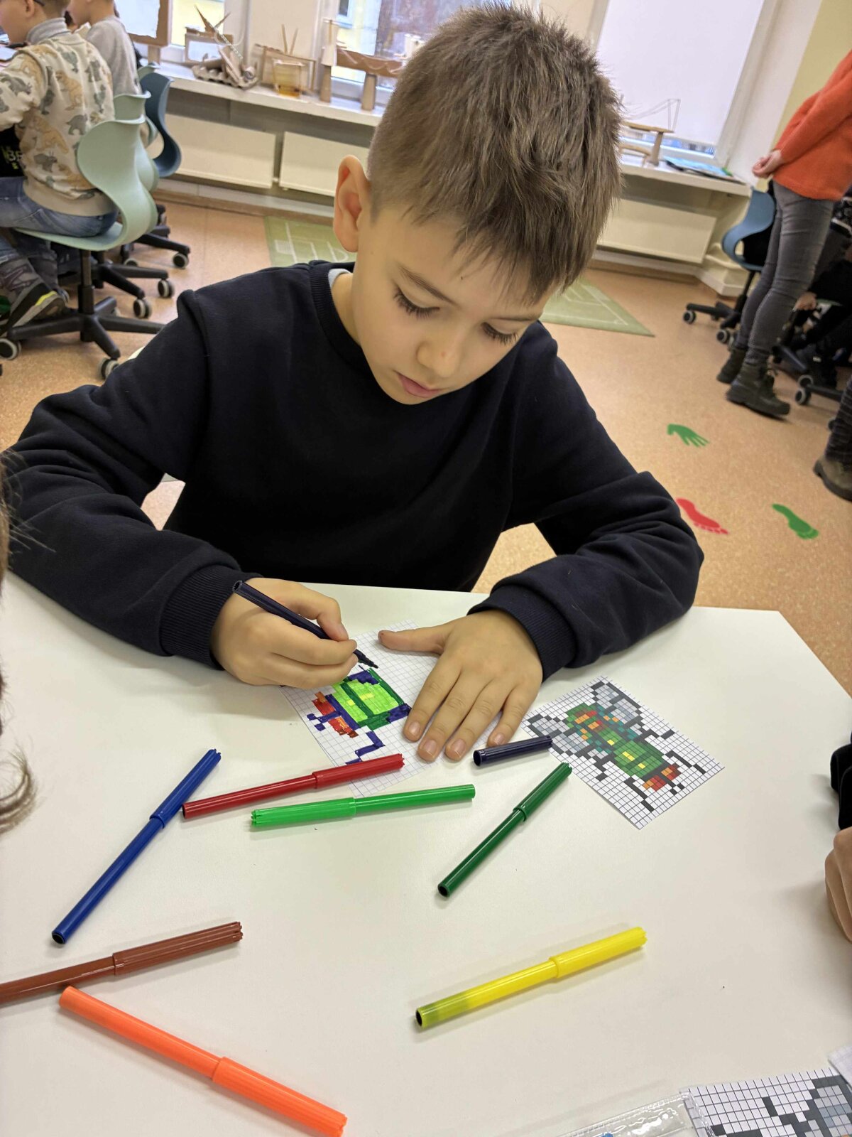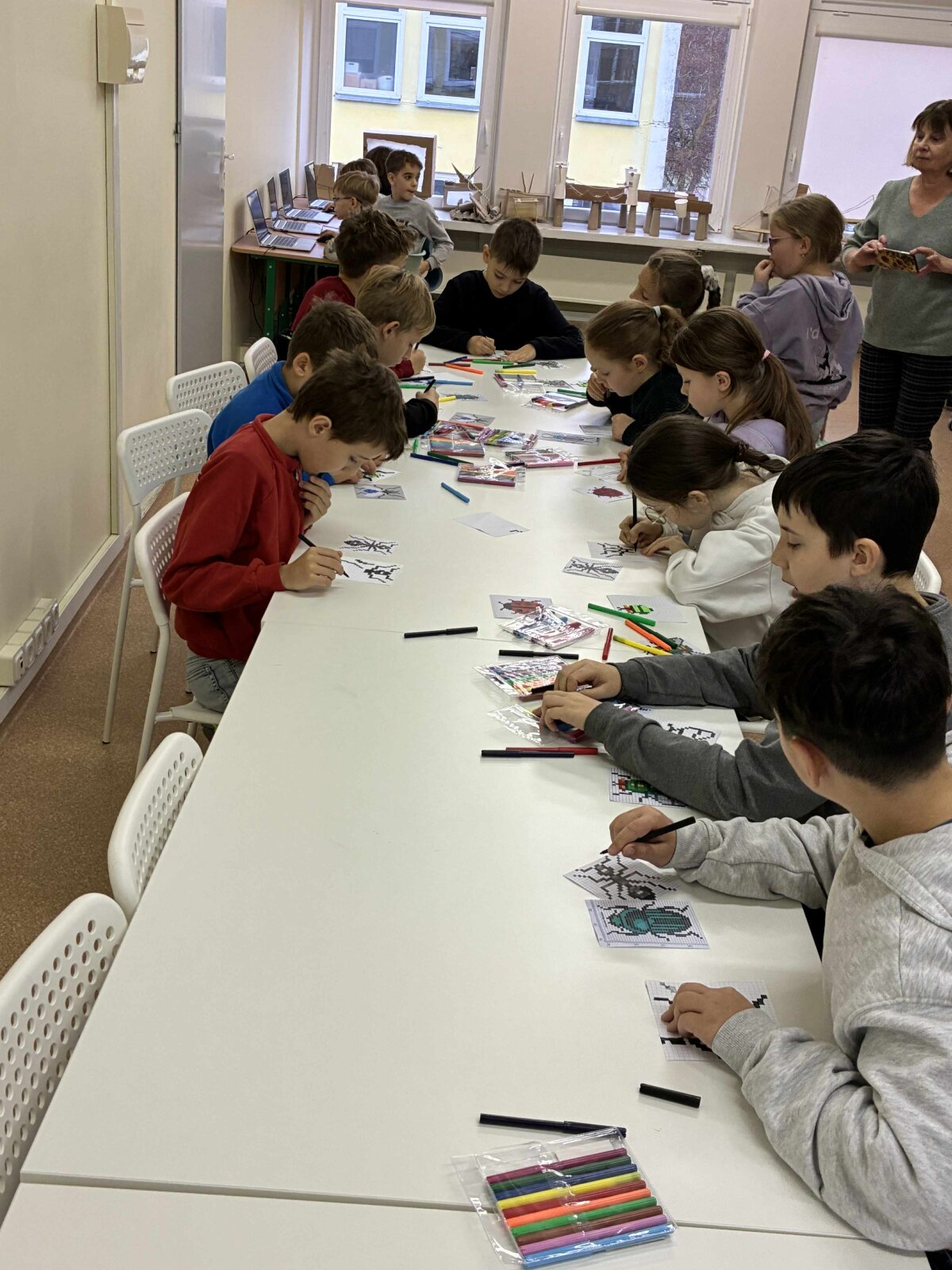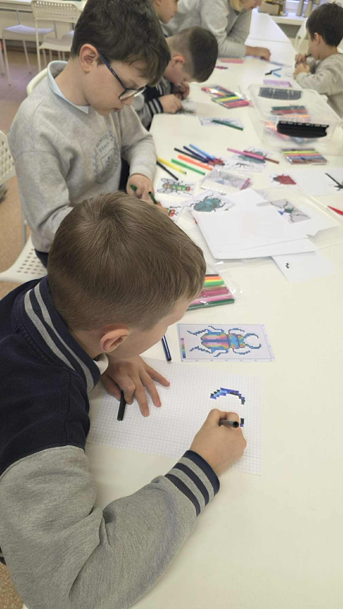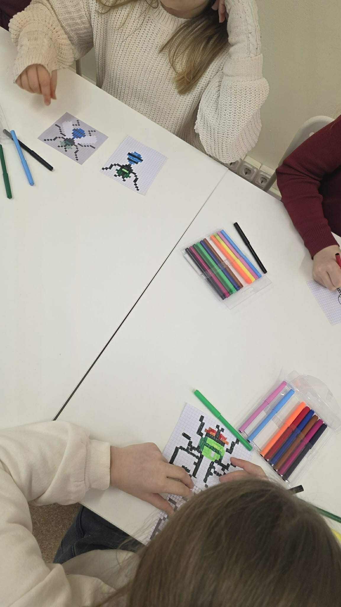 Vėliau mokiniai kūrė vabzdžių piešinius pikseliniu stiliumi. Popieriuje su langeliais arba skaitmeninėse piešimo programose. Šis etapas padėjo suprasti formų konstravimą iš paprastų geometrinių elementų.