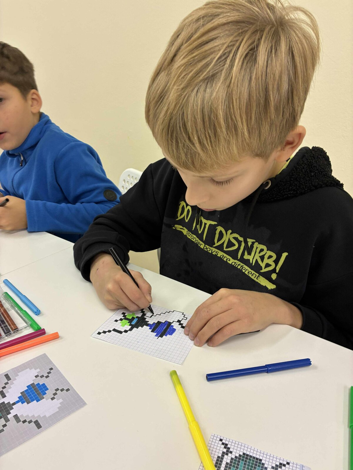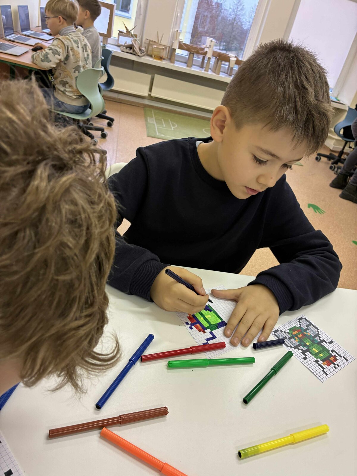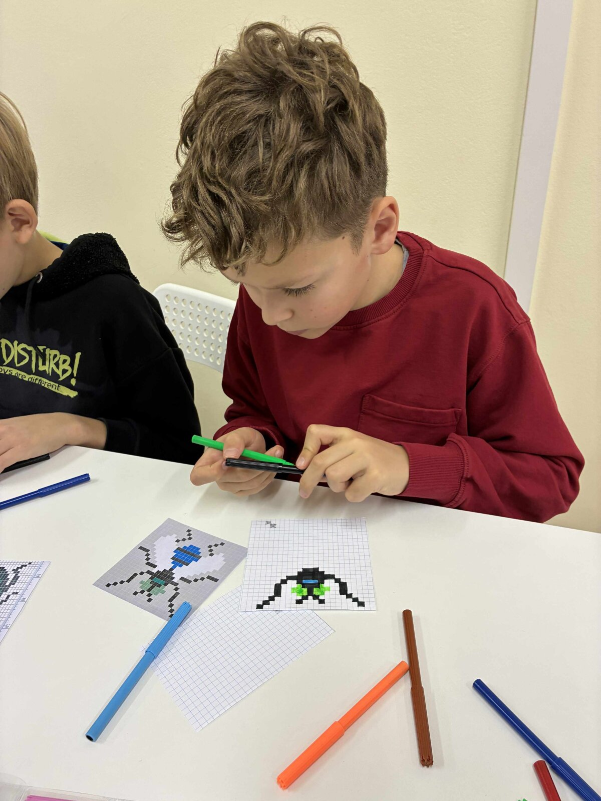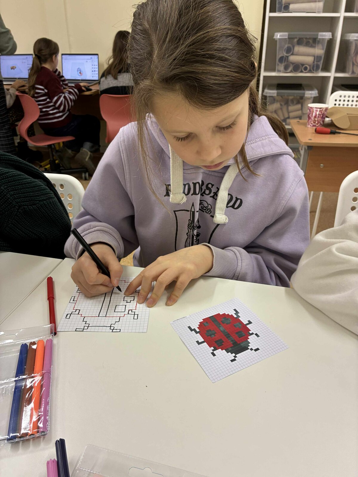 Vėliau mokiniai kūrė vabzdžių piešinius pikseliniu stiliumi. Popieriuje su langeliais arba skaitmeninėse piešimo programose. Šis etapas padėjo suprasti formų konstravimą iš paprastų geometrinių elementų.