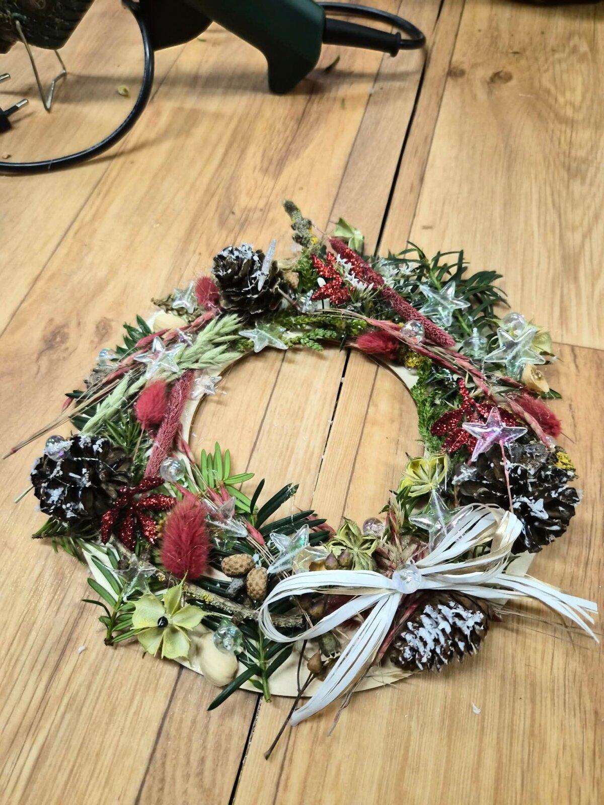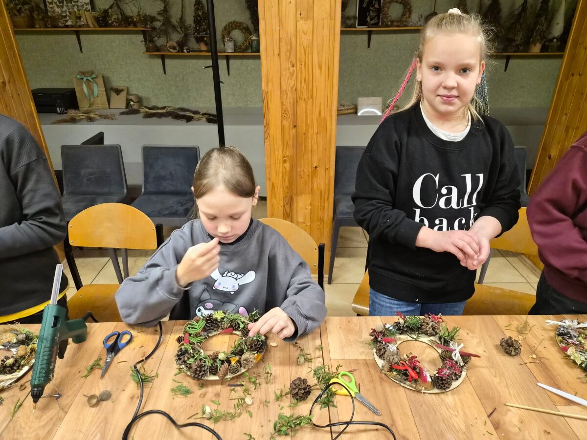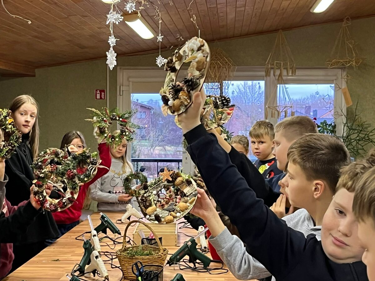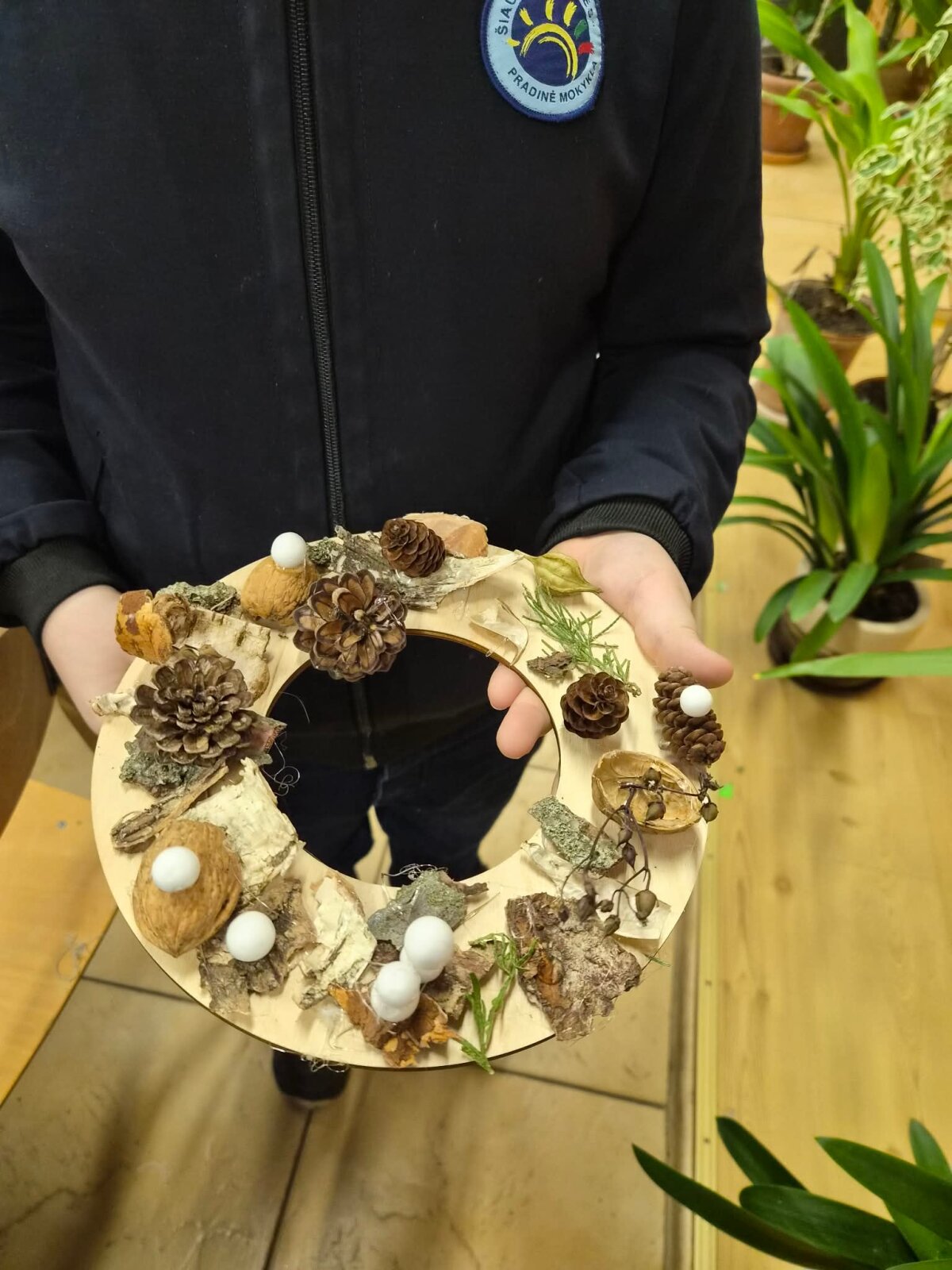 Po teorinės dalies mokiniai perėjo prie praktinės veiklos. Naudodami gamtines medžiagas - augalus, šakeles, džiovintas gėles - jie mokėsi pasigaminti iki 15 cm skersmens dekoratyvinį vainiką. Edukatorius pademonstravo kelis vainiko karkaso gaminimo būdus, taip pat pristatė galimybes kūryboje naudoti antrines žaliavas, akcentuodamas tvarumo ir atsakingo vartojimo svarbą.