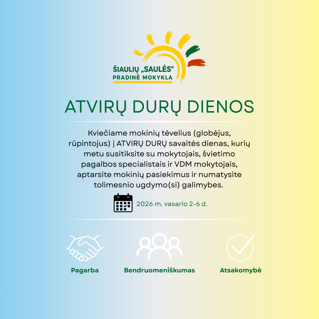 Sakoma, kad mokykla – tai antrieji namai 🏠, o bendruomeniški ir tvirti ryšiai kuriami per atvirą ir konstruktyvų bendradarbiavimą 🤝. Todėl maloniai kviečiame Jus į Atvirų durų dienas! ✨