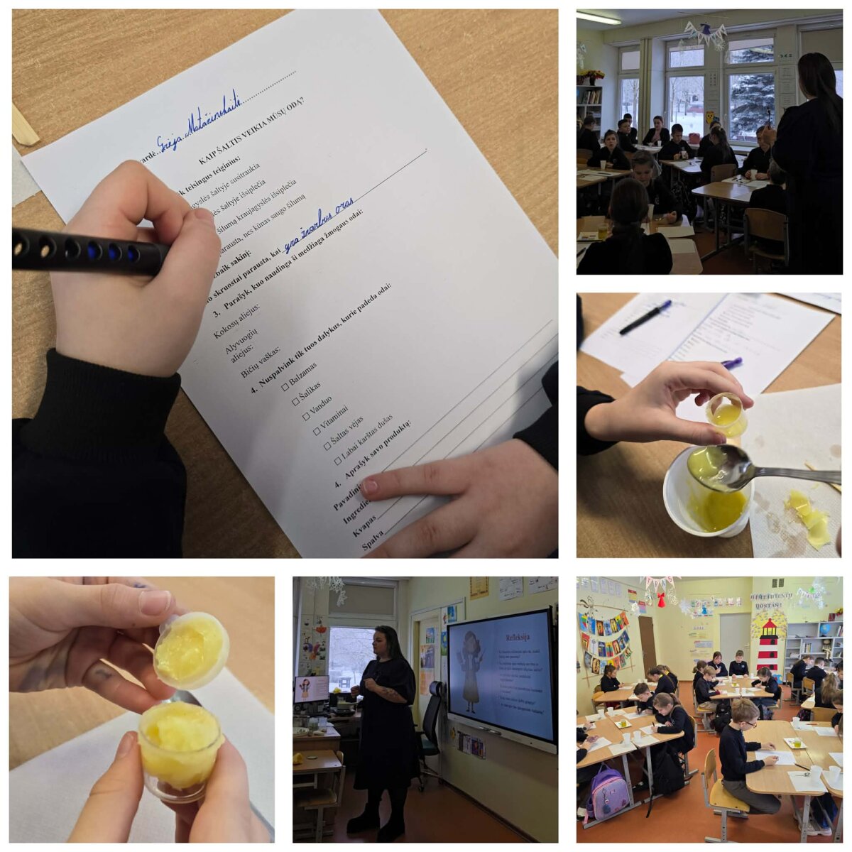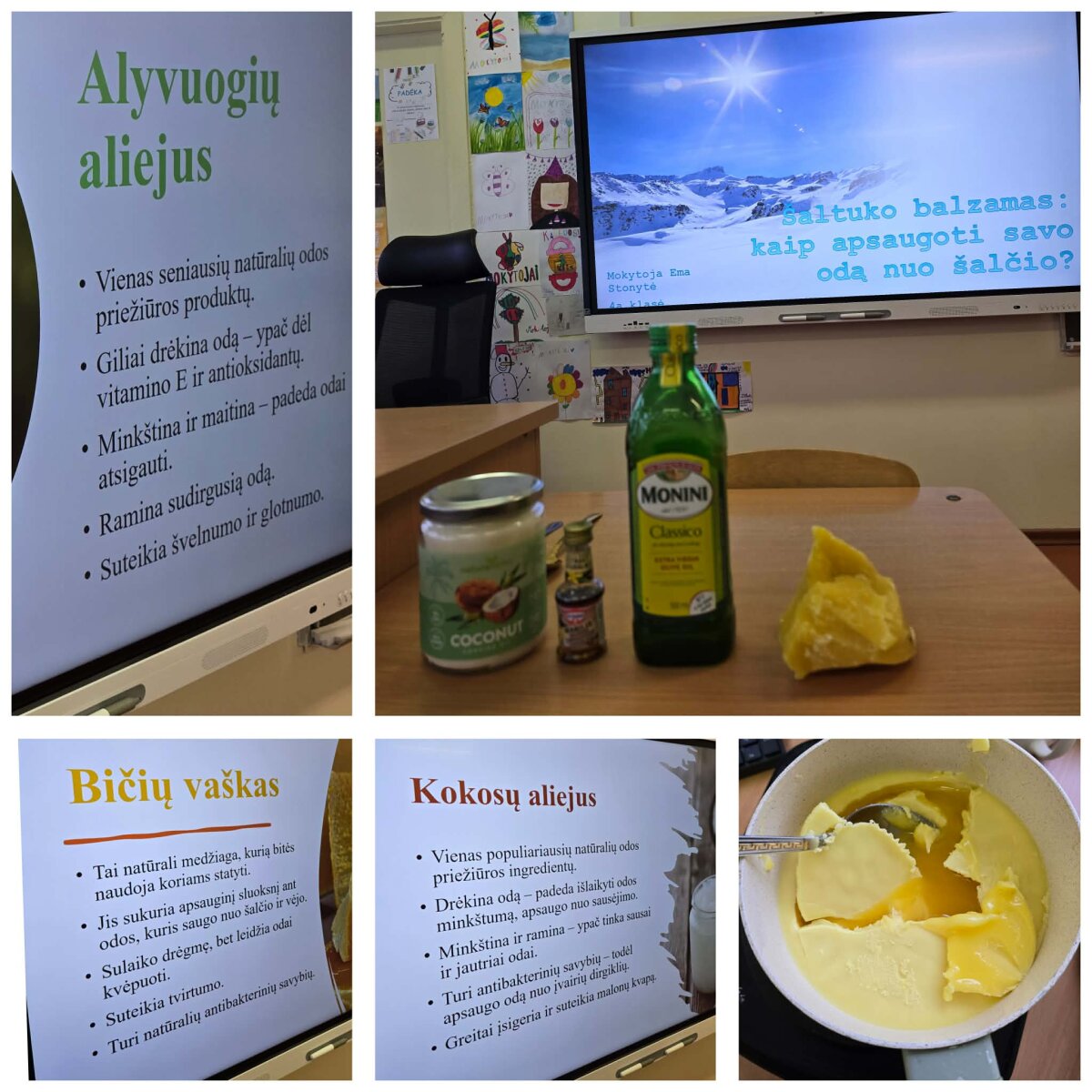 4a klasės mokiniai dalyvavo integruotoje gamtos mokslų ir technologijų pamokoje, kuri buvo organizuota taikant STEAM ugdymo principus. Pamokos metu mokiniai praktiškai tyrinėjo natūralių medžiagų savybes ir jų pritaikymą kasdienėje veikloje. Kartu su mokytoja gamino natūralų „Šaltuko“ balzamą.