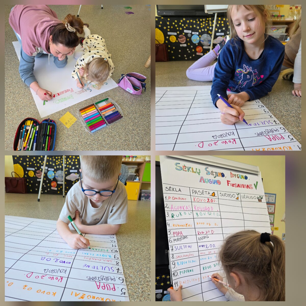 Svarbi projekto dalis – stebėjimas ir duomenų fiksavimas. Vaikai pildo specialią lentelę, kurioje žymi sėjos laiką, dygimo pradžią bei augimo pokyčius. Ant lango įrengti mini šiltnamiai, kuriuose sėklos stebimos dar atidžiau – naudojamos dygimo fiksavimo kortelės padeda sekti kiekvienos sėklos pokyčius.