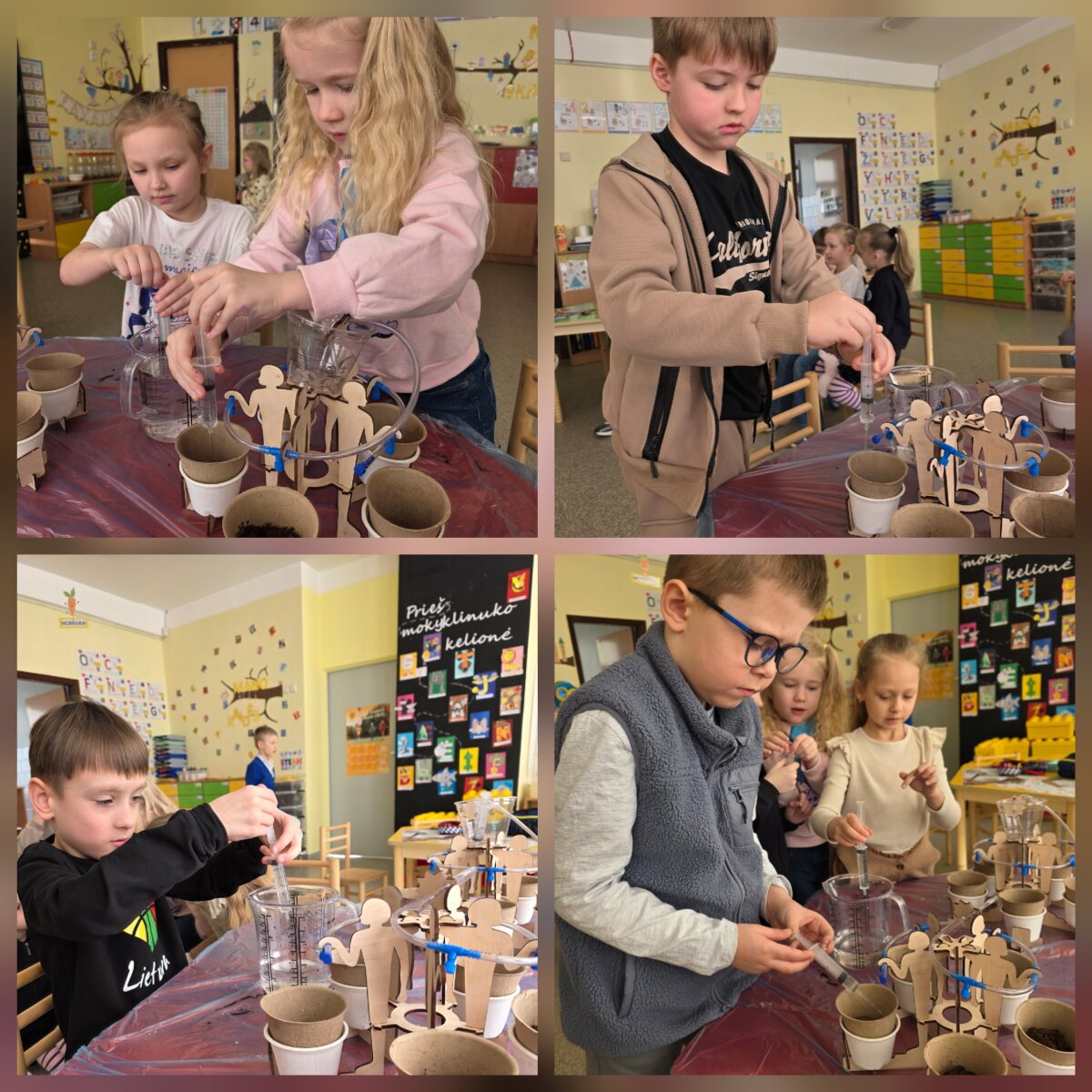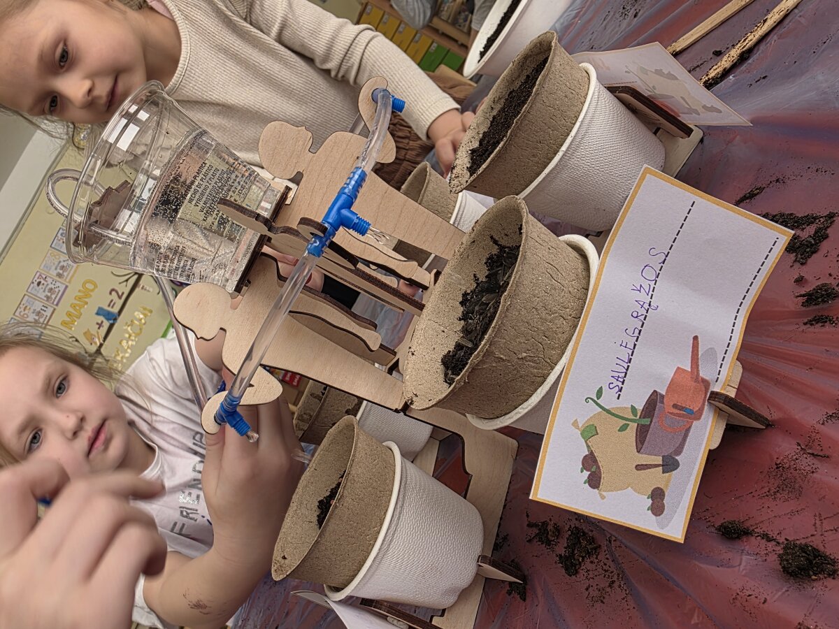 Projektas prasidėjo nuo praktinės veiklos – vaikai ne tik sėjo įvairias sėklas, bet ir konstravo laistymo sistemas. Pasitelkdami paprastas priemones, jie kūrė sprendimus, kaip vanduo gali pasiekti augalus. Ši veikla tapo puikia galimybe integruoti inžinerinio ugdymo elementus: vaikai eksperimentavo, bandė skirtingus būdus, stebėjo rezultatą ir diskutavo apie veiksmingiausius sprendimus.