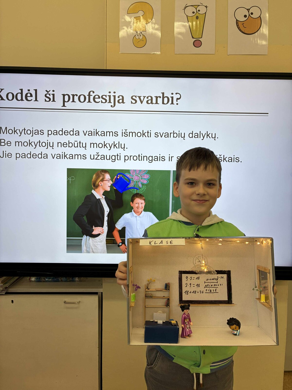 Klasėje buvo sukurta improvizuota paroda, kuri tapo tikru mažuoju muziejumi. Čia buvo galima pamatyti santechniko naudojamus vamzdžius, suvirintojo pirštines, gydytojų instrumentus, architektų brėžinius, kepėjo gaminius, geografijos specialistų atributiką ir daugybę kitų profesijas reprezentuojančių eksponatų. Ši paroda ne tik papuošė klasę, bet ir leido vaikams praktiškai susipažinti su skirtingų profesijų pasauliu.
