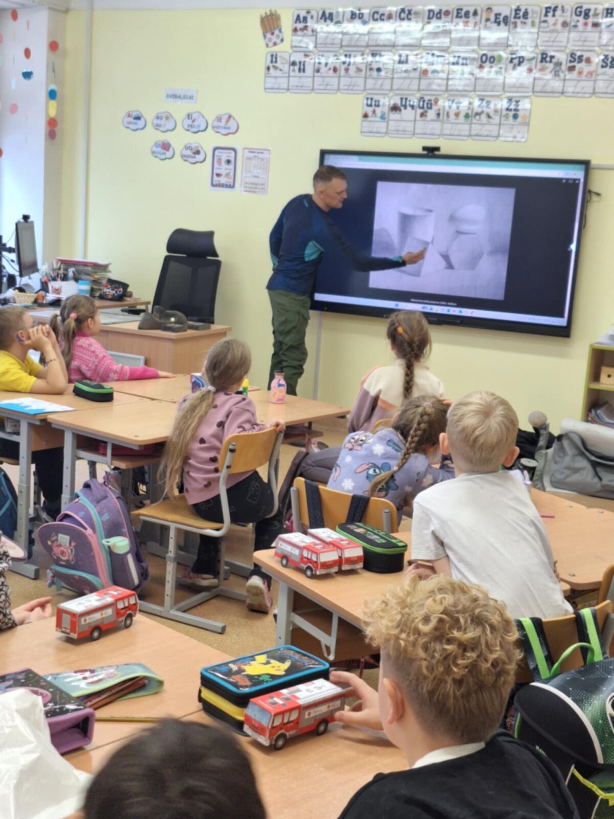 Ado tėtis, gaisrininkas - gelbėtojas, supažindino vaikus su savo profesija, parodė specialią gelbėjimo įrangą ir aprangą bei papasakojo apie gelbėjimo veiksmus ir skubios pagalbos teikimo procesą.