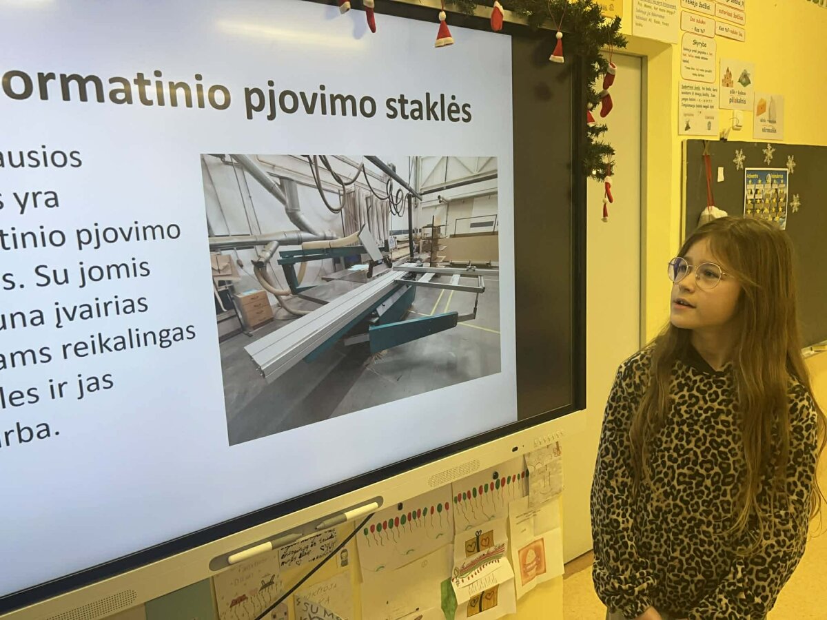 Gustė Balčaitytė supažindino bendraklasius su butelių ruošinių gamybos procesu, Karina Dagilaitytė papasakojo apie atsakingą stiklo paketų gamybos vadybininkės darbą, Austėja Marganavičiūtė pristatė auklėtojos padėjėjos kasdienes pareigas, Emilija Klenauskaittė apibūdino staliaus amato kūrybiškumą ir kruopštumą, o Lukas Pliuskus pasidalijo žiniomis apie savanorystės svarbą bei pardavėjos darbo specifiką.