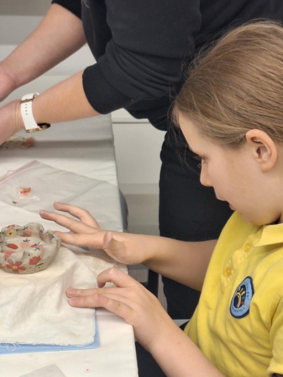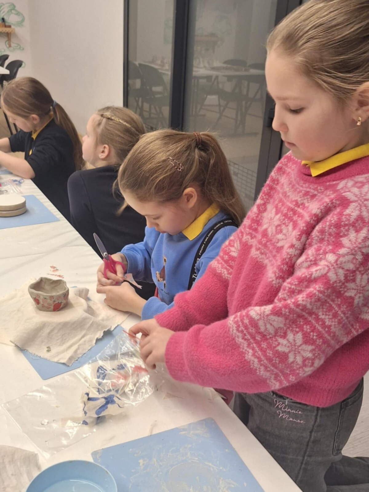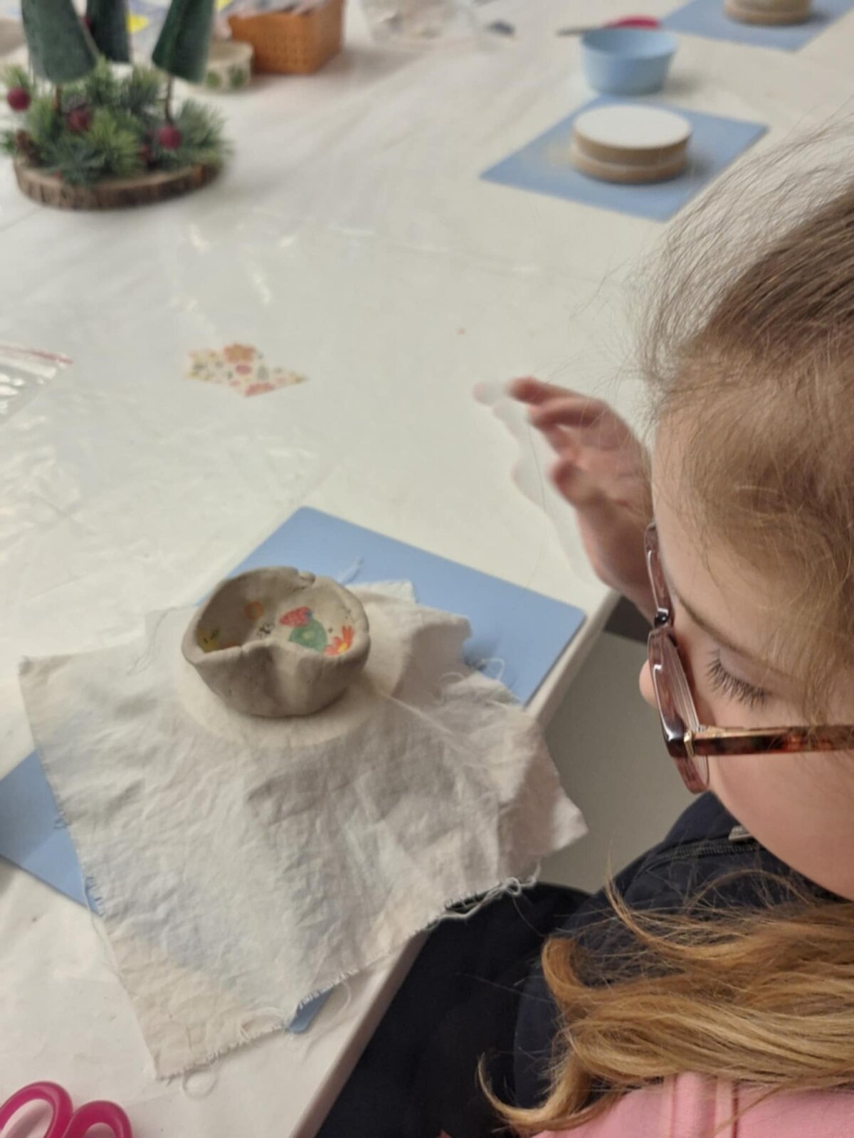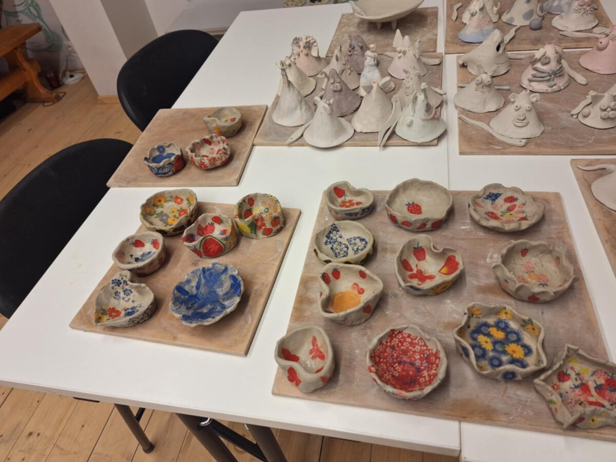 Praktinėje veiklos dalyje mokiniai lipdė indelius ir padėkliukus iš molio, kuriuos dekoravo poglazūriniu popieriumi, suteikdami darbeliams spalvų ir įvairių raštų. Kūrybinė veikla leido vaikams patirti visą kūrybos procesą - nuo sumanymo iki galutinio rezultato.